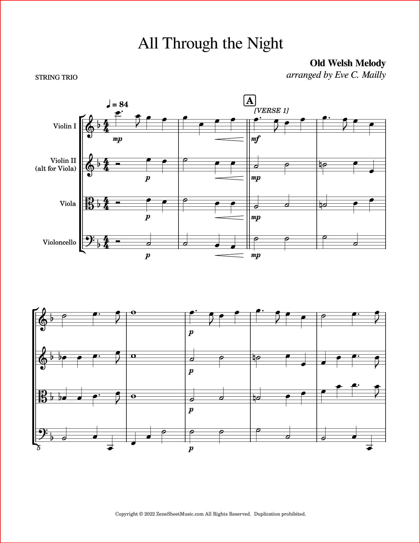 All Through the Night is an old Welsh melody that can be sung as a love song, a lullaby, and is often used for traditional Christian worship services. This arrangement is for string trio, with each of the three verses arranged differently – from simple to more complex. The harmonies are beautiful and flowing, making this piece a great choice for any event. As with all of our trio arrangements, the middle part is included in both treble and alto clef. Score and parts – 11 pages.