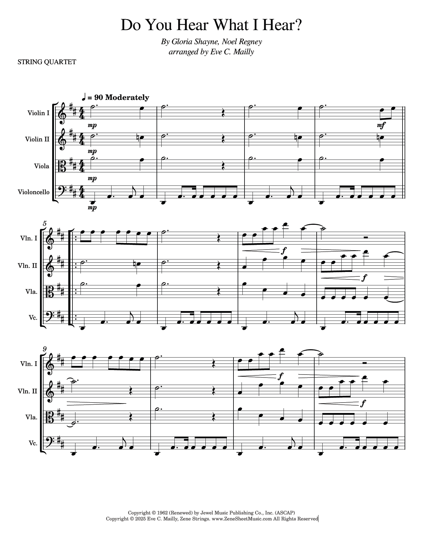 Do You Hear What I Hear? is a song written in October 1962, with lyrics by Noël Regney and music by Gloria Shayne. The song was wrote as a plea for peace during the Cuban Missile Crisis of that year. It has been a popular Christmas favorite for decades, and has been recorded by dozens of artists. Score, set of parts 9 pages.