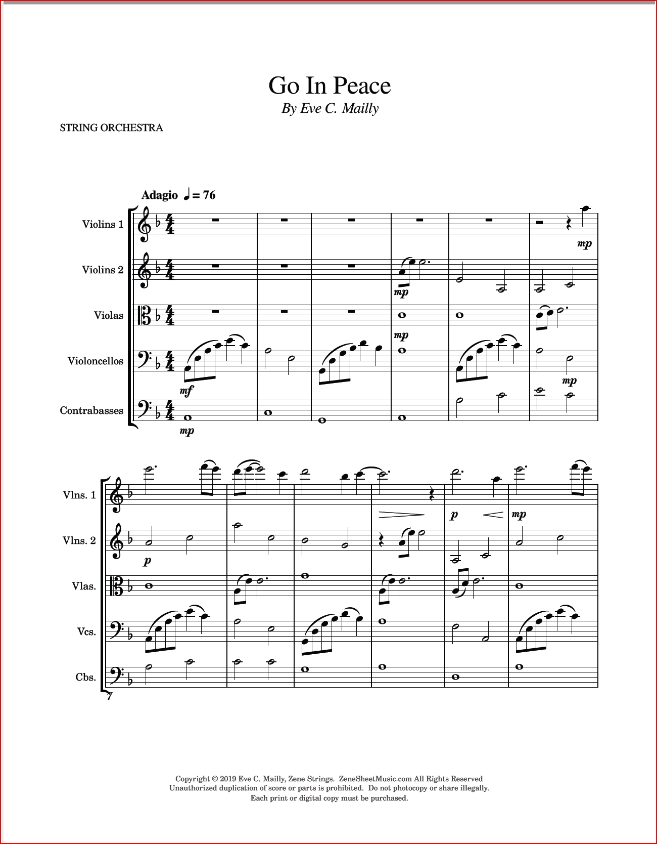 Go In Peace is an original composition for string orchestra, written by Eve C. Mailly. The piece evokes the sound of gentle, rolling waves through the use of arpeggios in the cellos, with the first violins providing a melodic line that soars above the waves. The middle voices repeat a three note motif of “A-E-E” which emulates the sound of the words “Go In Peace”. The string basses provide a deep grounding for the piece through the use of steady whole notes.