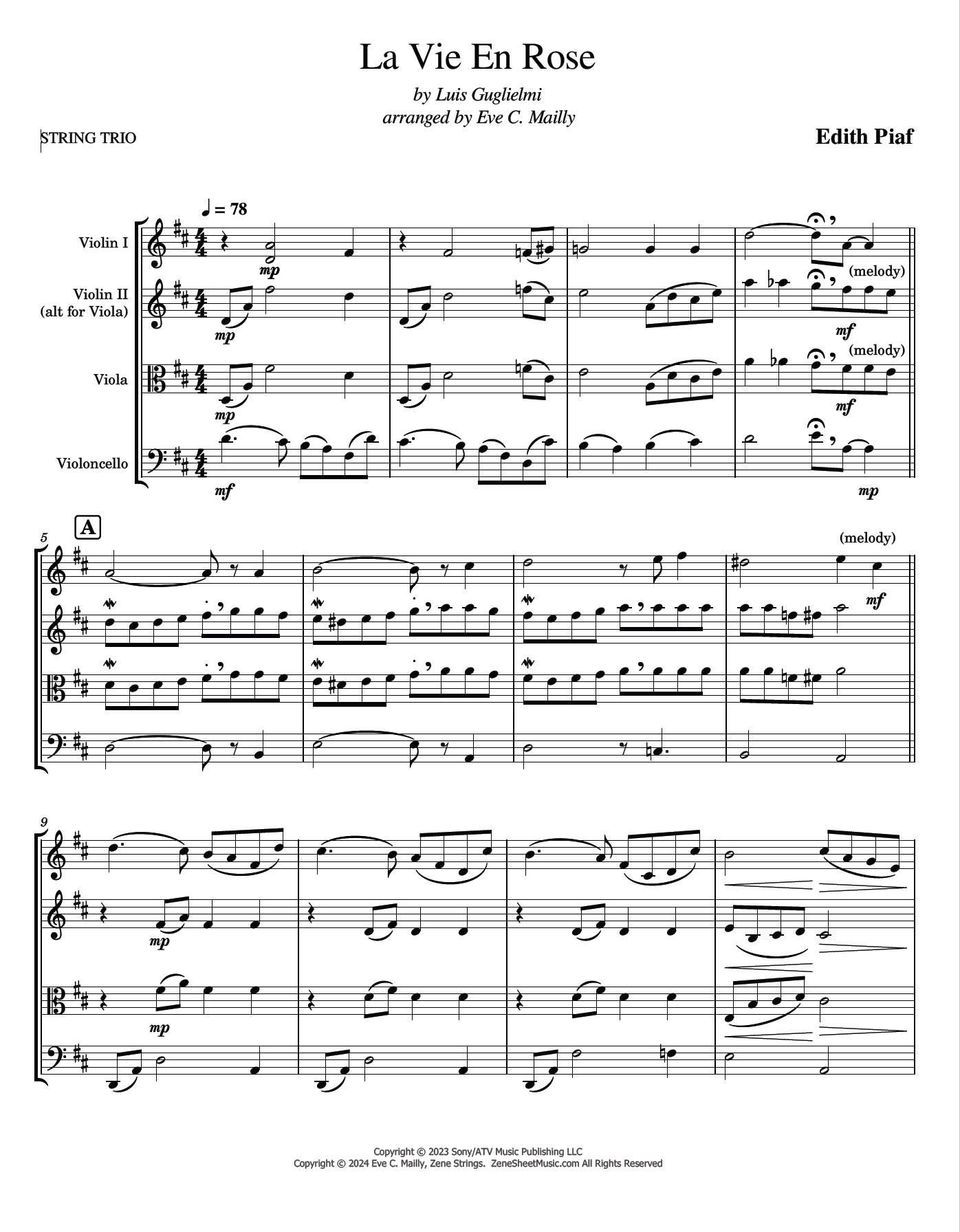 La Vie en Rose is a beautiful song by Louis Guglielmi – lyrical and melodic. This arrangement is for String Trio, and captures the rich harmonies and Parisian feel of the original — from your friends at Zene Strings! As with all of our trio arrangements, the middle part is included in both treble and alto clef, giving you the flexibility of performing the piece with two violins and a cello OR a violin, viola and cello. Score, set of parts 14 pages.