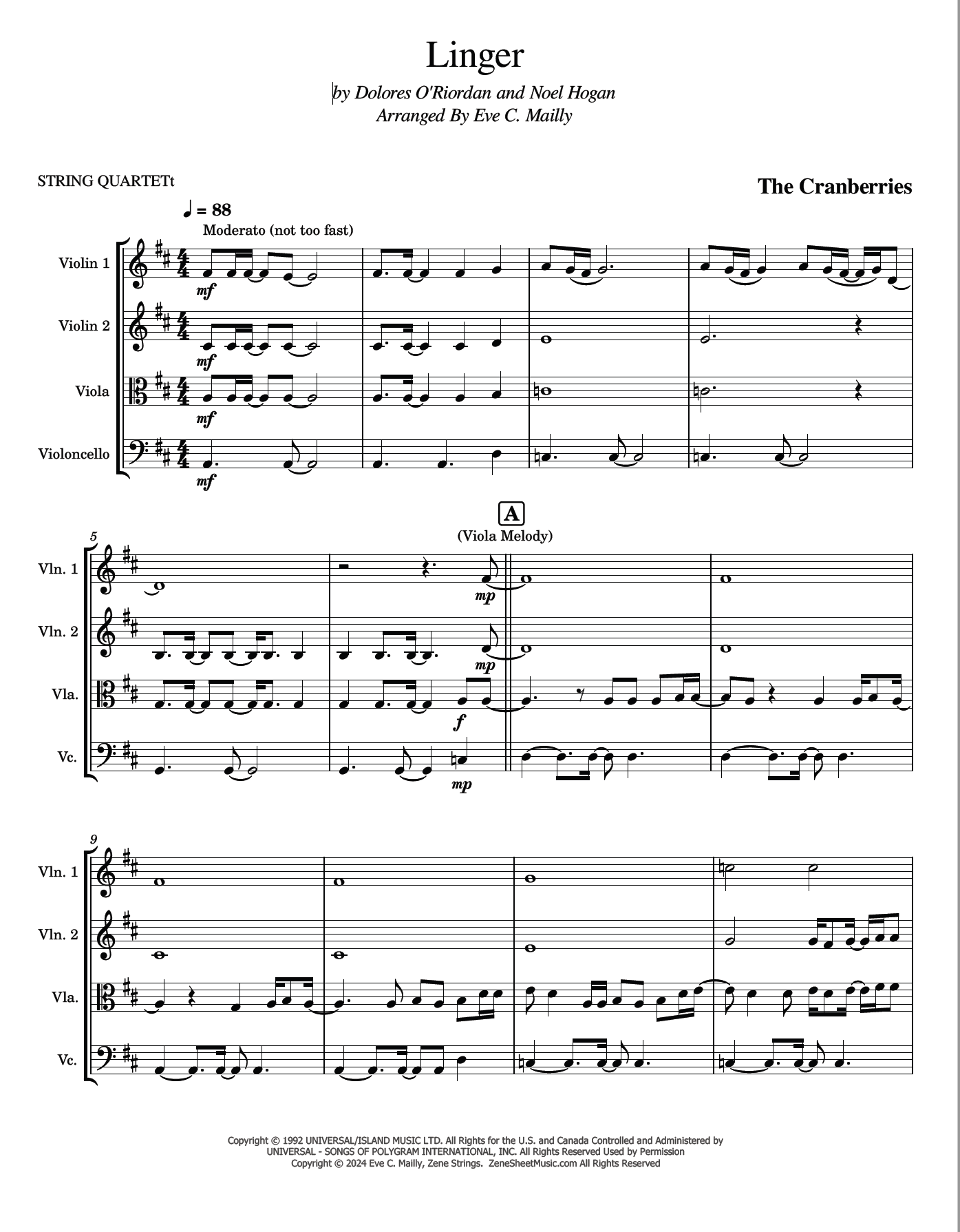 Linger is a classic 90’s favorite by The Cranberries, arranged for String Quartet from your friends at Zene Strings! String-friendly key of “D”, with 1st violin, 2nd violin and viola sharing the melody. Score, Set of Parts. Watch it on You Tube – HERE!