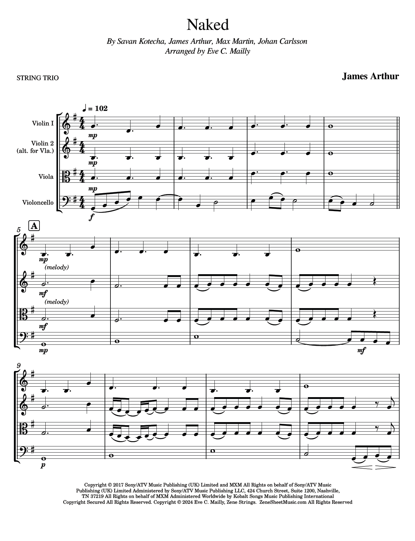Naked is a song created and recorded by British singer and songwriter James Arthur. This arrangement is for string trio, and can be played by either two violins and a cello, or violin, viola and cello, giving you great performance flexibility. The score shows the middle part in both treble (violin 2 alternative) and alto clef (viola). Score, set of parts 21 pages. Watch it on You Tube – HERE!